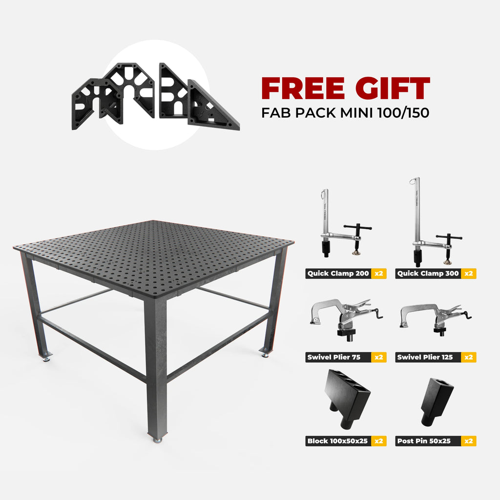 • Table holes are 16 mm diameter on a 50 mm grid, designed for use with the Fireball 19 mm system clamps and fixtures.