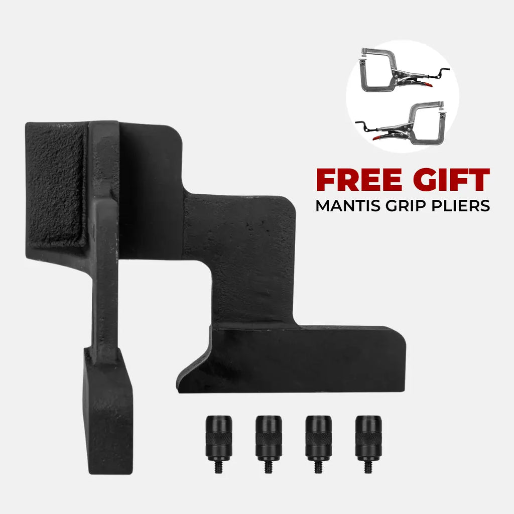 - Tapped holes in both feet for installing pins that quickly align the feet with the 50 mm grid pattern of common welding tables